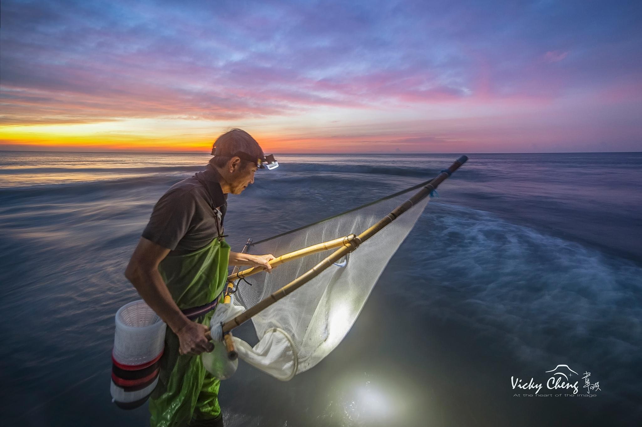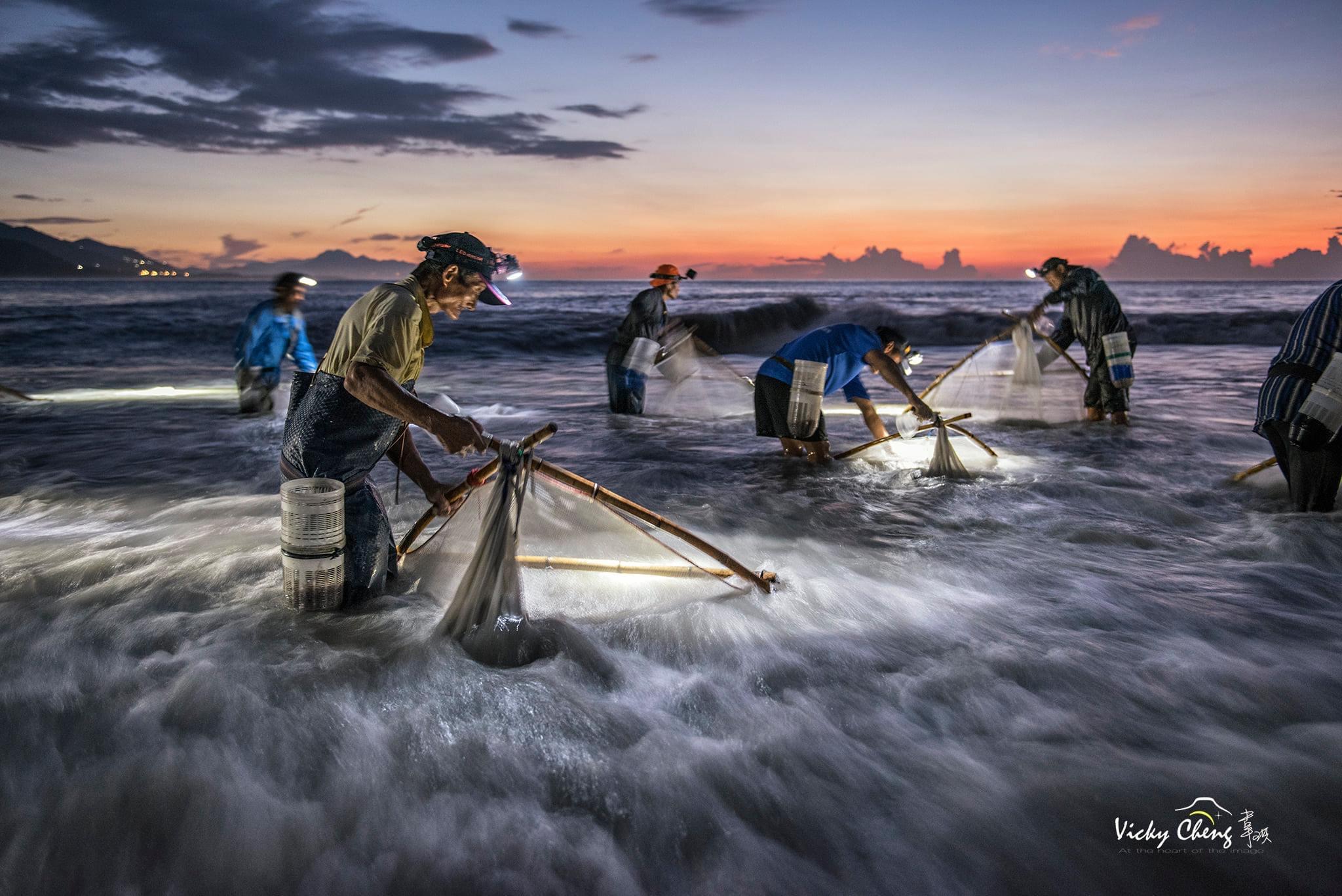 隔天凌晨,帶大家前往金崙溪出海口拍攝漁夫撈魚苗的獨特景象,從黑夜、色溫到日出的金色光芒時刻,完整記錄漁民的辛苦與收穫。