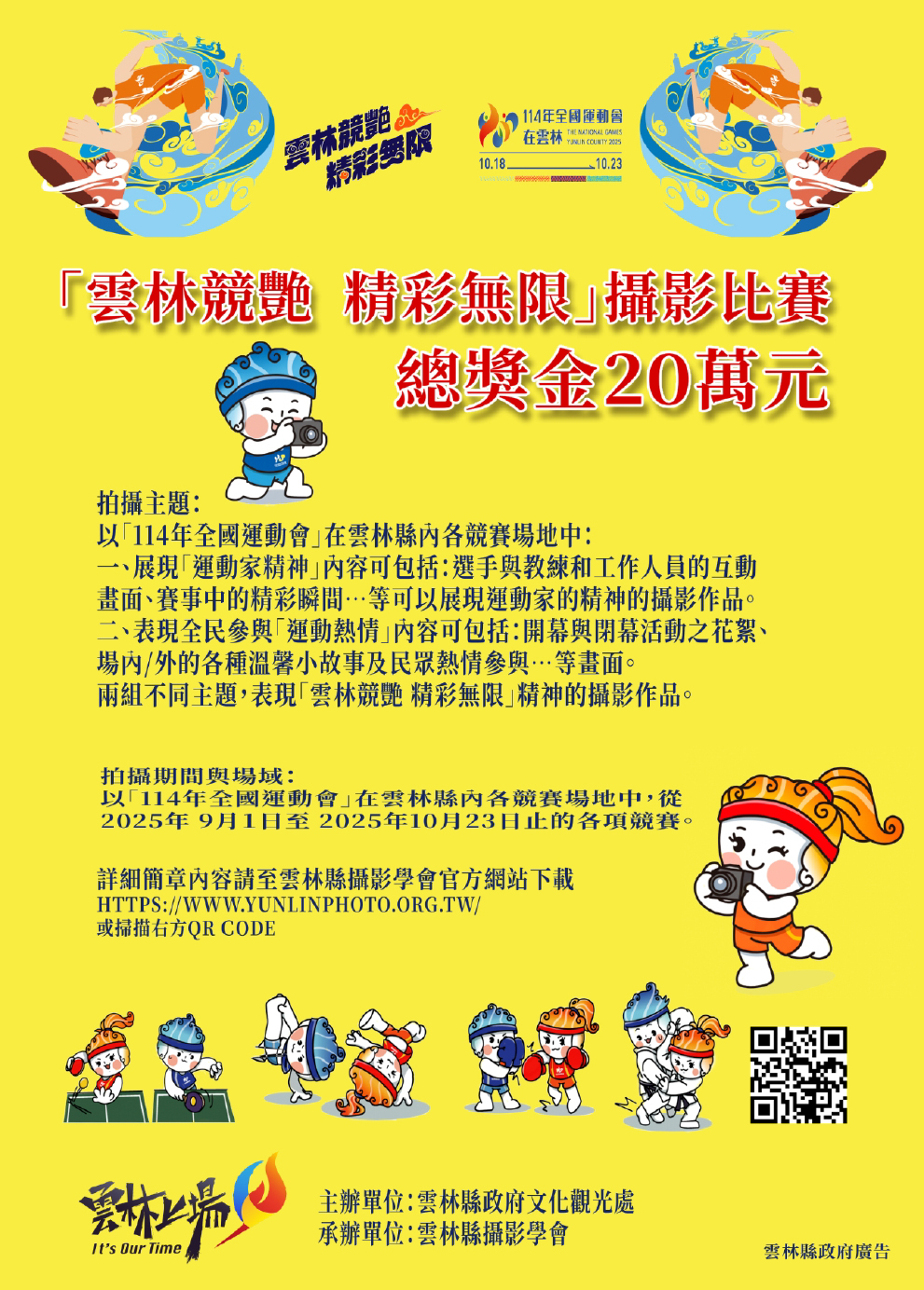 雲林縣睽違二十年,再度榮獲承辦全國運動會的殊榮,不僅展現了本縣在籌辦全國性大型體育賽事的實力與決心,更是一場向全國推廣雲林魅力的難得機會,讓各地民眾共同感受「雲林競艷 精彩無限」的精彩故事。為了紀錄這場全國矚目的體育盛會,特別舉辦以「雲林競艷 精彩無限」為主題的攝影比賽,邀請參賽選手、攝影愛好者及來自全國各地的遊客,一同透過鏡頭捕捉賽場上激烈競技的瞬間、場邊動人的互動,以及民眾熱情參與的身影。每一張照片,都是屬於雲林的故事篇章。透過影像的力量,讓更多人看見雲林不僅是農業大縣,更是充滿活力的體育與觀光新據點。