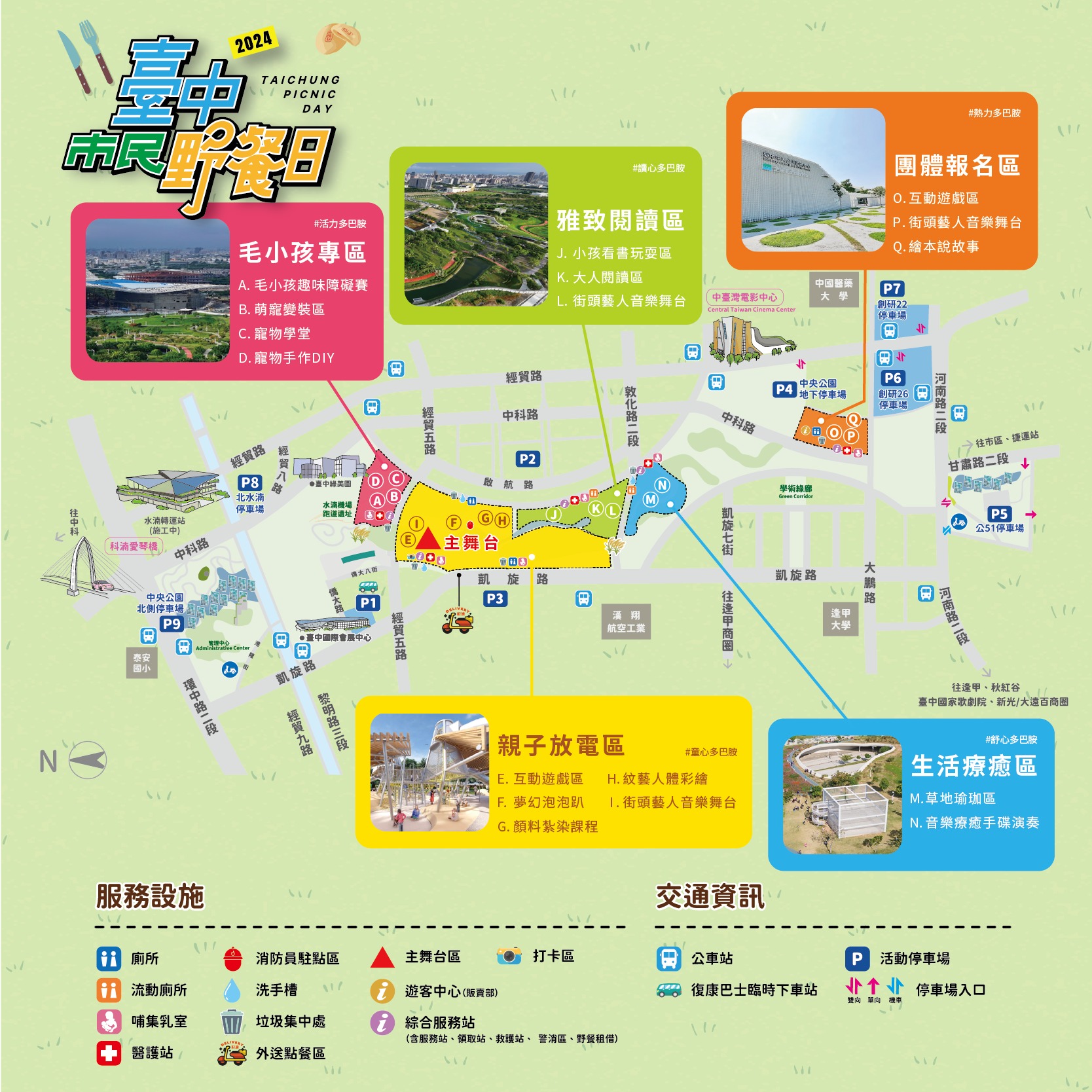 建設局表示,「2024台中市民野餐日」主場區「中央公園」由建設局與西屯區公所共同主辦,活動主題為「釋FUN多巴胺」,規劃五大主題區域,分別為毛小孩專區、親子放電區、雅致閱讀區以及生活療癒區和團體報名區等,讓每位市民都能找到屬於自己的活動空間,釋放快樂、活力與多巴胺。大家可自備美食,與親愛的家人一起在這片綠意盎然的草地上,享受美好時光,創造難忘的回憶。