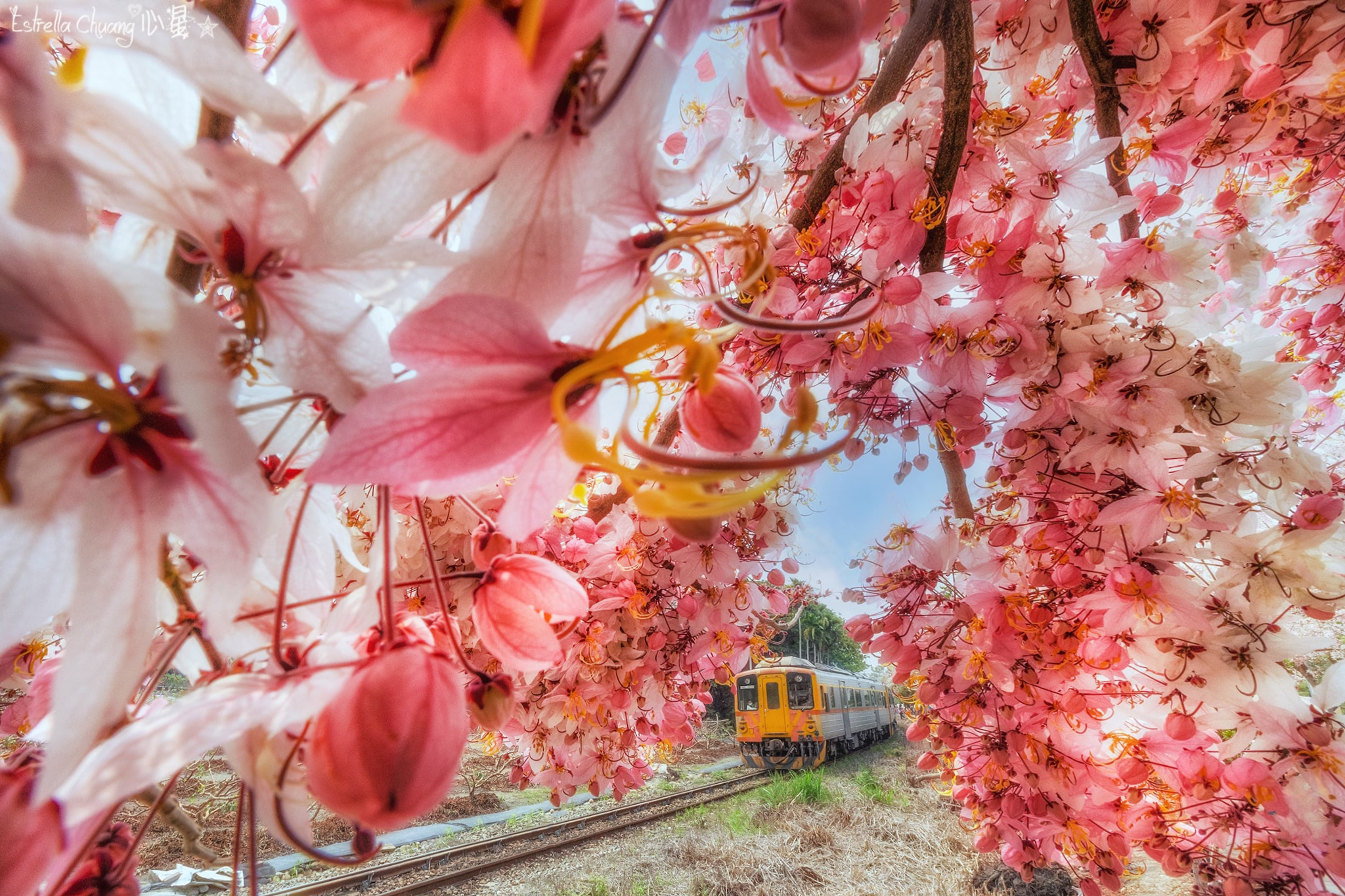 ※器材與拍攝建議:若緊貼著花旗木樹下或花叢拍攝,鏡頭使用以超廣角、廣角到中焦段為佳,將樹、花、列車完整包覆。但偶爾也可離開樹下,選擇自行車道護欄邊緣或其他空曠處,以長鏡頭拉近壓縮鐵軌彎道、列車與連綿花海的空間視覺,呈現出更壯觀的花海景緻。