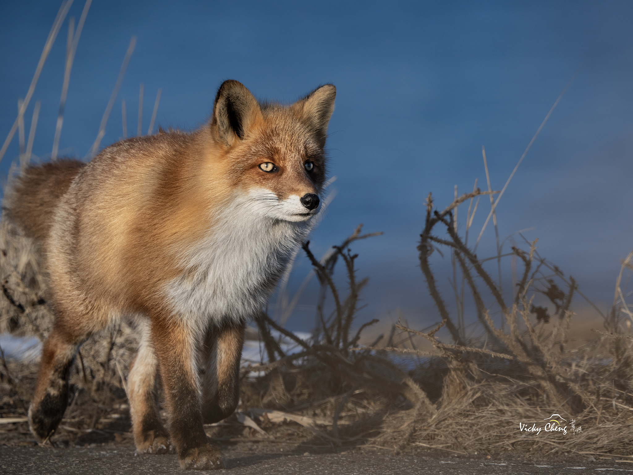 韋琪說:「在拍攝北狐時,由於距離遠加上前方有雜草、樹枝的阻擋,一時之間我一直對不到焦。於是我趕緊開啟了動物+眼部辨識功能,讓相機自動辨識後,竟然瞬間準焦,辨識的快速與精準度讓我有驚艷到!」